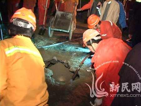 当新民网记者赶到事发现场时,警方已在现场拉起了警戒线。有40多名的9号线地铁施工人员正在现场紧张地处置抢修塌陷的路面。施工人员用铁锹把沙石填入塌陷坑中,再使用水泥搅捣设备将灌入塌陷坑中的黄沙石子和水泥进行搅拌以控制塌陷面积的扩大。直至晚上11点,抢险工作仍在进行中,抢险施工人员已经向塌陷的坑中填灌了20余吨黄沙石子。