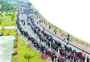 上午10时左右,随着人流的不断涌入,领票长龙从中大人造草坪体育场蜿蜒而行,途经图书馆,直至公共教学楼附近。记者以正常步速行走走完整个队伍,足足用了7分钟,估计队伍长达一公里以上。