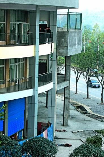 在女子上方三楼阳台的栏杆上还吊着一根两米长布绳,和女子腰间布绳一样。同时记者还看到在栏杆下的墙壁上还发现有挣扎过的脚印。