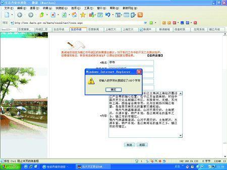 记者昨日登录“生态丹徒”的官方网站,在政府信息公开的栏目右侧,“区长信箱”非常醒目,信箱下设三个栏目,分别是“我要咨询”、“我要投诉”、“我要建议”。记者依次点开各个栏目,按照要求填入相关资料,分别填写了一段500字左右的文字到了咨询、投诉和建议邮箱,在点击“发送”键后,页面弹出警示框显示“您输入的字符长度超过100个字符”,文字无法提交。重新回到投诉等页面,将输入文字控制在100字内,内容顺利地显示提交成功。
