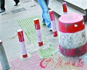 广州日报1月5日报道人行道“拦路虎”为何老搬不动?记者调查发现,地铁口、人行道的“拦路虎”越来越多,甚至霸占了盲道。本报曾报道地铁华师站E出口5米范围内违规设置路障的报道曝光后,并未得到有效纠正。记者回访发现,经过“整改”,原先直接钉在盲人道“条形引导砖”上的铁柱虽被拆除了,但有关部门却在盲人道两侧,竖起两根更高的铁柱卡住盲人道。