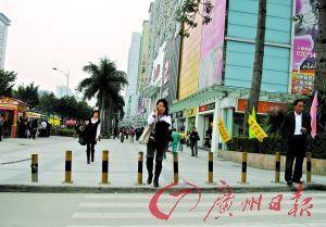 在地铁客村站的好又多广场上靠近行人斑马线边,一排十数根密集的铁柱路障挡住去路,甚至有铁柱钉在了盲道上。在老城区和靠近市郊很少见到这样的路障。