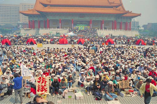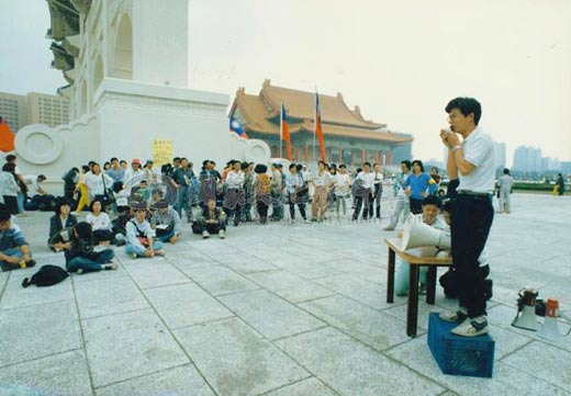 1990年3月16日,在新一次“国民大会”要“选举”李登辉为“总统”的前夜,9名台湾大学的学生到中正纪念堂前广场静坐抗议,拉出写著“我们怎能再容忍七百个皇帝的压榨”的白布条,为“三月学运”揭开了序幕。由于媒体的报道,3月17日的傍晚已有200多名学生进驻广场静坐,在学生静坐现场旁围观的群众,已迅速突破2000人,台大自由派学者并于同日发起“柔性罢课”,宣布自19日起一周将上课地点改在中正纪念堂广场。