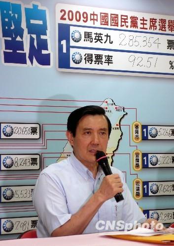 中国国民党7月26日举行党主席、党代表选举,马英九获得28万5354票,得票率93.87%,当选党主席。图为马英九当晚在竞选办公室发表谈话。 中新社发 刘舒凌 摄