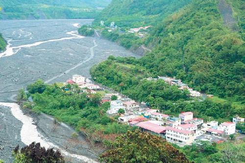 “莫拉克”风灾期间,山区崩山严重,导致荖浓溪河床堆积大量土石,河床被垫高,桃源乡的勤和村彷佛坐落河床上。图片来源:联合报