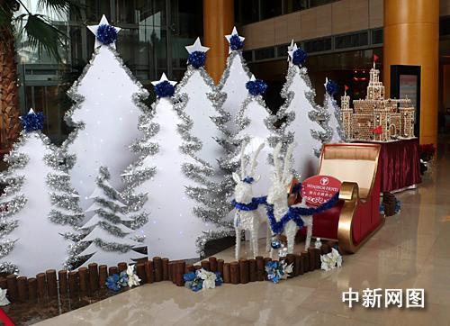 采访第四次“陈江会谈”记者入住的金典酒店大堂中的圣诞老公公。