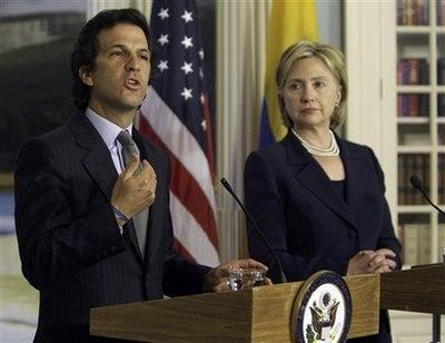 美国国务卿希拉里8月18日与哥伦比亚外长贝穆德斯在华盛顿举行新闻发布会。(图片来源:美国媒体)
