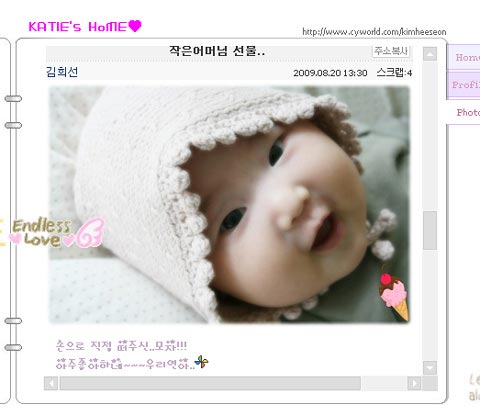 中新网8月24日电 8月20日,金喜善在自己的赛我网迷你小窝中公开了多张妍儿的照片,并写下“请好好欣赏”等充满撒娇语气的话。