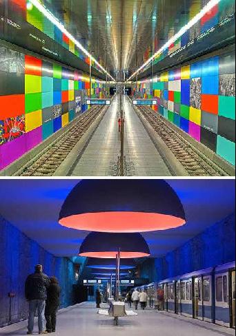 慕尼黑城市地铁(U-Bahn)(德国):慕尼黑公共交通系统非常出色,包括郊区火车、城市地铁、市内有轨电车和公交线路,把城市的每个部分完美的结合起来。这个地铁系统已经在1972年开放,站台干净漂亮。早期的地铁(上)设计上具有简约的风格,而后来的地铁(下)设计上增添了许多有趣的元素和一些艺术作品。
