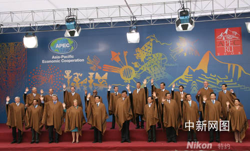为期两天的亚太经合组织第十六次领导人非正式会议,二十三日在秘鲁首都利马结束。图为各成员领导人在会后身着南美披风合影。齐彬摄